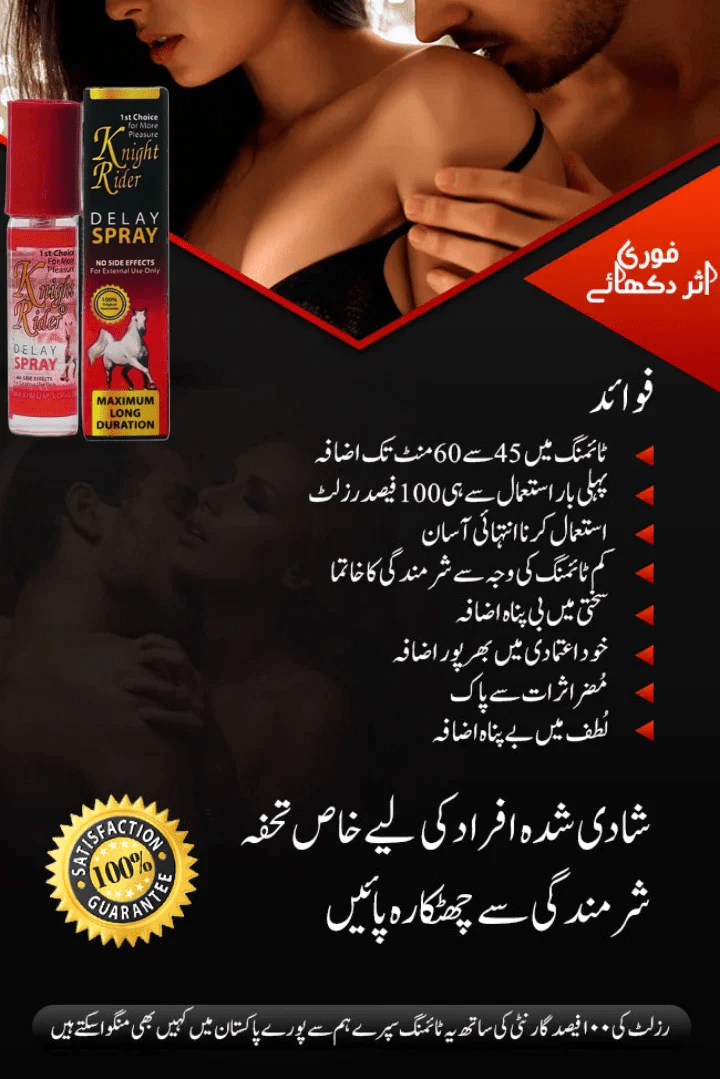 نائٹ رائڈر ڈیلے سپرے ایک خصوصی پروڈکٹ ہے جسے مردوں کے لیے ڈیزائن کیا گیا ہے تاکہ وہ اپنی جنسی کارکردگی اور لذت میں اضافہ کر سکیں۔ یہ سپرے مردانہ ٹائمنگ کو بڑھانے میں مدد کرتا ہے، جس سے آپ اور آپ کے ساتھی دونوں کو زیادہ دیرپا اور بھرپور خوشی مل سکتی ہے۔ اس کی منفرد فارمولیشن صرف بیرونی استعمال کے لیے ہے اور اسے دعویٰ کیا جاتا ہے کہ اس کے کوئی مضر اثرات نہیں ہیں۔ نائٹ رائڈر ڈیلے سپرے کی یہ خصوصیت اسے ان افراد کے لیے ایک قابل اعتماد انتخاب بناتی ہے جو اعتماد کے ساتھ اپنی ازدواجی زندگی کو بہتر بنانا چاہتے ہیں۔ یہ سپرے آپ کی قوتِ ارادی اور جنسی صحت کو بحال کر کے آپ کے تعلقات میں اعتماد اور قربت کو بڑھانے کا ذریعہ بن سکتا ہے۔